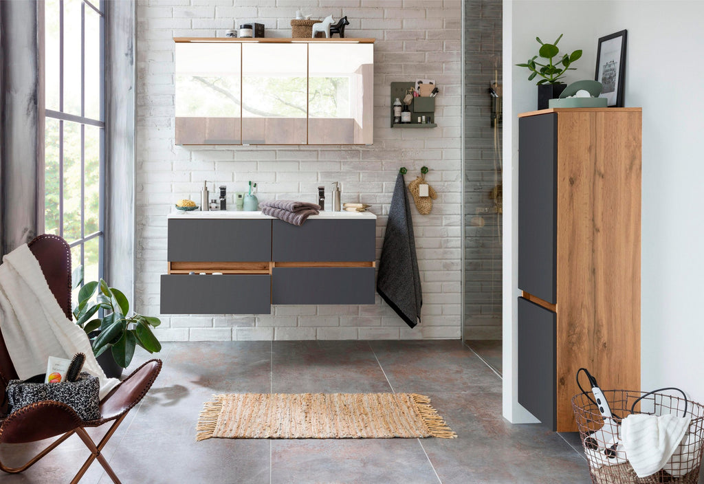 Zum Verkauf steht ein modernes Badezimmermöbel-Set der Serie Lucca in der Farbe Eichefarben/Grau. Das Set ist funktional, hochwertig verarbeitet und bietet viel Stauraum.