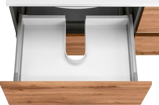 Der Waschtisch verfügt über einen Doppelwaschplatz aus Mineralguss sowie mehrere geräumige Schubladen für Handtücher, Pflegeprodukte und Zubehör.